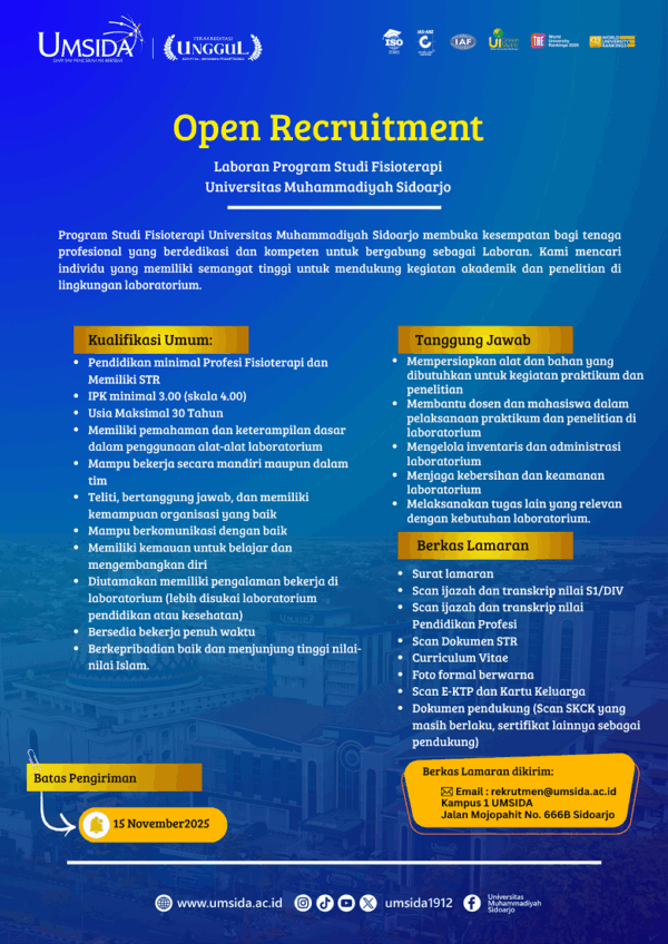 Program Studi Fisioterapi Universitas Muhammadiyah Sidoarjo membuka kesempatan bagi tenaga profesional yang berdedikasi dan kompeten untuk bergabung sebagai Laboran Program Studi Fisioterapi. Posisi ini ditujukan bagi individu yang memiliki integritas, kemampuan teknis, serta semangat tinggi untuk mendukung pelaksanaan kegiatan akademik dan penelitian di lingkungan laboratorium Fakultas Ilmu Kesehatan Universitas Muhammadiyah Sidoarjo.